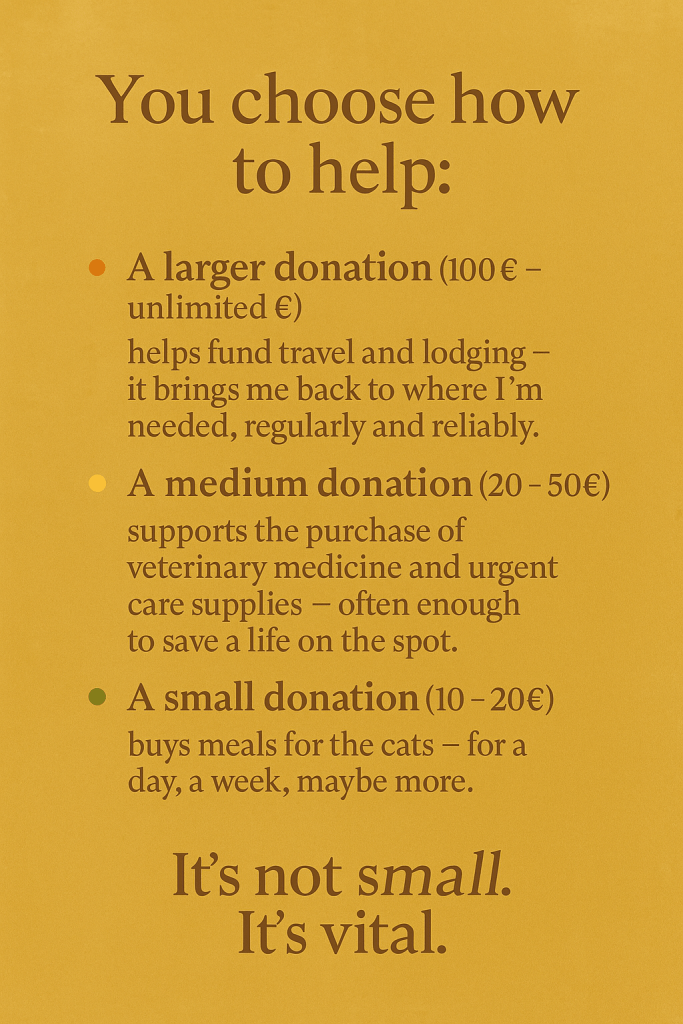 Con ciò che ho ricevuto — e mettendo di tasca mia tutto il resto — ho acquistato cibo, medicine, antiparassitari. Ho creato contatti, lasciato istruzioni e aiuti concreti a chi vive lì ogni giorno.
