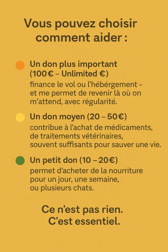Ma questa missione non può fermarsi. Se voglio tornare ogni mese e mezzo, se voglio garantire cibo, cure e continuità… ho bisogno di te.