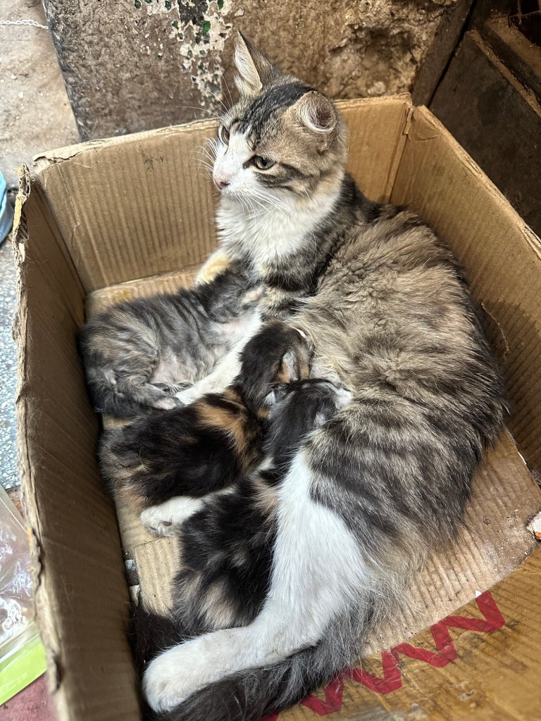 Accanto a loro, una gattina più piccola dei fratellini. Non capisco se sia figlia di un’altra mamma o se la vita le sia stata più dura fin da subito.